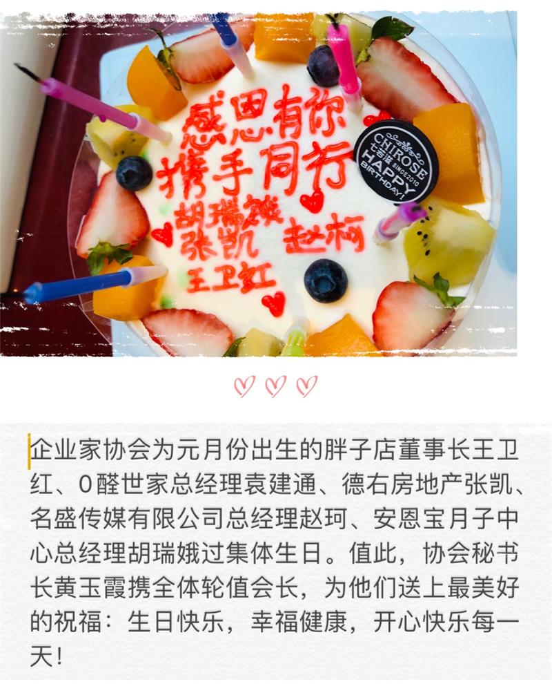 本次生日活動由一月份值班會長錢俊霞主持,首先,由協(xié)會的小天使姚璐聲情并茂的誦讀了《致壽星的祝?!罚泵貢L范文彥代表全體會員致辭,范秘書長在致辭中講到:圓圓的生日蛋糕象征一個團結(jié)的集體,一支支閃亮的蠟燭像一顆顆跳動的心,燃起一根小小的蠟燭。希望會員們既要分享蛋糕的甜美,也要共擔創(chuàng)業(yè)路上的艱辛,未來大家要更加團結(jié)一致,攜手前行!