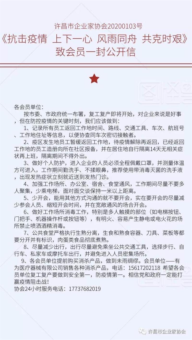 按照許昌 市政府關(guān)于做好疫情防控工作的要求,在即將復(fù)工開業(yè)前, 企業(yè)家協(xié)會向全體會員發(fā)出了《抗擊疫情、上下一心、風(fēng)雨同舟、共克時艱》的公開信,號召會員企業(yè)嚴(yán)格按照政府 安排 ,全面做好疫情防控工 作。協(xié)會秘書處在微信群里轉(zhuǎn)發(fā)了 100多條黨中央、國務(wù)院關(guān)于做好疫情防控工作的重要指示,轉(zhuǎn)發(fā)了市委、市政府、市工商聯(lián)等下發(fā) 的疫情 防控政策和措施,讓會員充分發(fā)揮自身平臺的優(yōu)勢,為抗擊疫情工作出力。