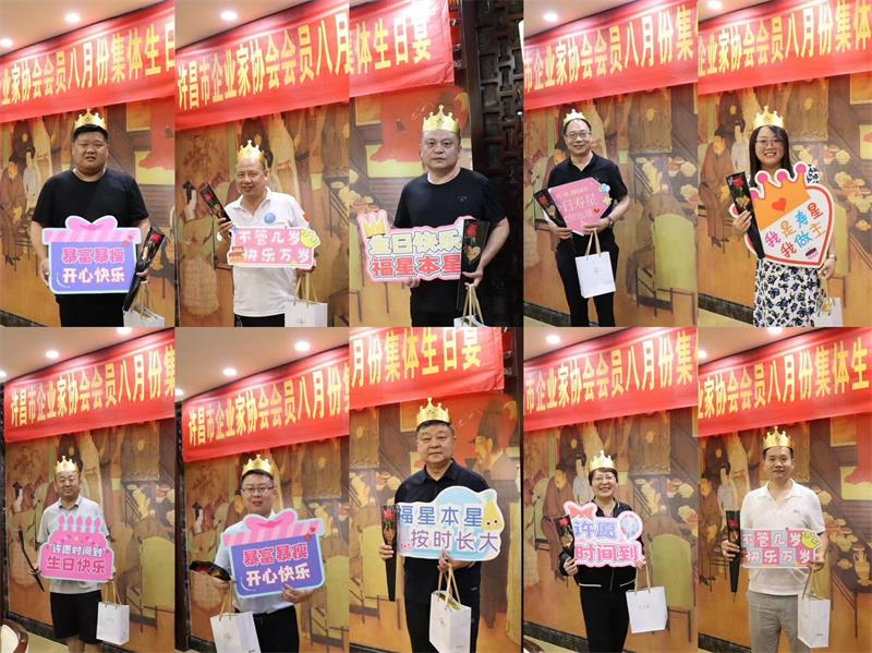 8月7日晚上,許昌市企業(yè)家協(xié)會8月份集體生日宴,在世春閣酒店溫情舉辦。秘書長黃玉霞、婦聯(lián)主席曲釗霞、值班會長任天培等共20位協(xié)會會員相聚共度生日宴。