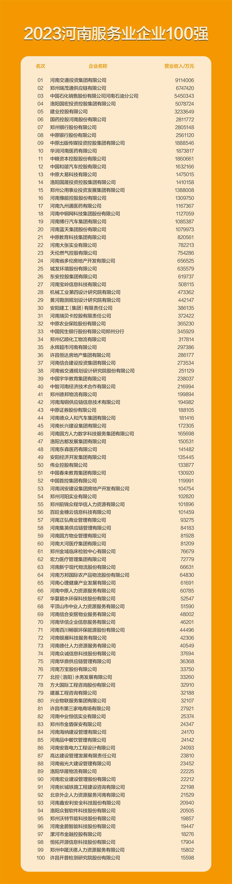 許繼集團(tuán)有限公司、河南黃河實業(yè)集團(tuán)股份有限公司、西繼迅達(dá)電梯有限公司;許昌市榮獲“2023河南服務(wù)業(yè)企業(yè)100強(qiáng)”的企業(yè)有